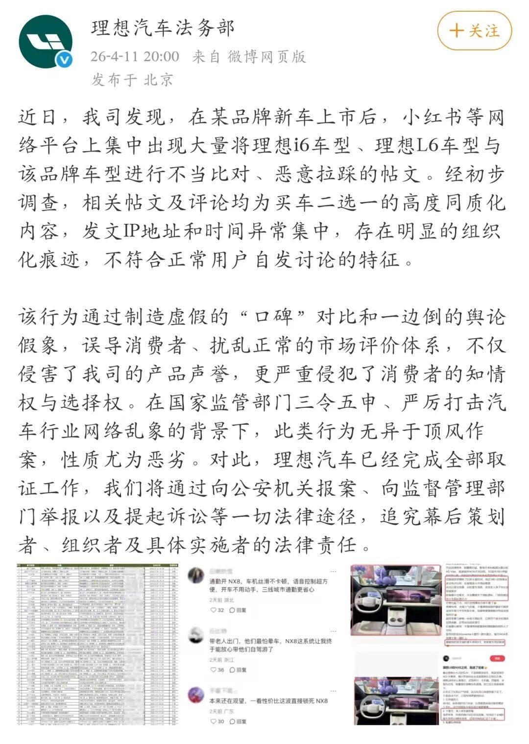 近日,我司发现,在某品牌新车上市后,小红书等集结平台上聚首出现无数将理思i6车型、理思L6车型与该品牌车型进行不妥比对、坏心拉踩的帖文。经初步探望,关连帖文及褒贬均为买车二选一的高度同质化实质,发文IP地址和时分十分聚首,存在彰着的组织化印迹,不稳妥昔时用户自觉权衡的特征。