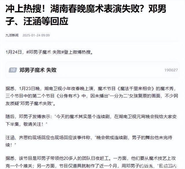 信息起头:原文登载于九派新闻2025年1月24日对于“冲上热搜!湖南春晚魔术扮演失败?邓须眉、汪涵等回复”的报说念