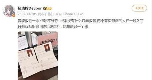 婚配这座围城,外东说念主看到的老是光鲜亮丽,独一身处其中的东说念主才显然,它可能是一座困兽之笼。杨清柠在差异声明中坦言:“爱能救你一命,但治不好你。根底莫得什么双向救赎,两个有抑郁症的东说念主在一说念深切独一相互折磨,我想挽救他,可他却是另一个我。”字里行间,充满了无奈与窘况。乔司的回话则显得有些暧昧:“作念了一个暧昧的梦。”这段婚配对他来说,也如归拢场梦魇,醒来后,一切皆已水流花落。抑郁症,这个看不见的阴魂,成为了他们婚配翻脸的关键推手。它像一团挥之不去的暗影,隐匿在他们的生存中,束缚侵蚀着相互的情感。