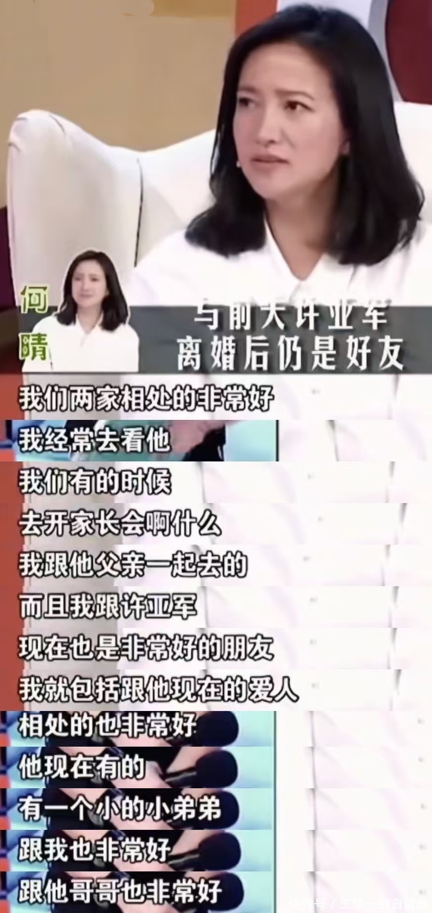 仳离多年后,何晴在一档节目中坦言,仳离后她和许亚军是好一又友关系,她说他们一王人开家长会,一王人好好带孩子,她还说她和许亚军的现任配头的关系也很可以。
