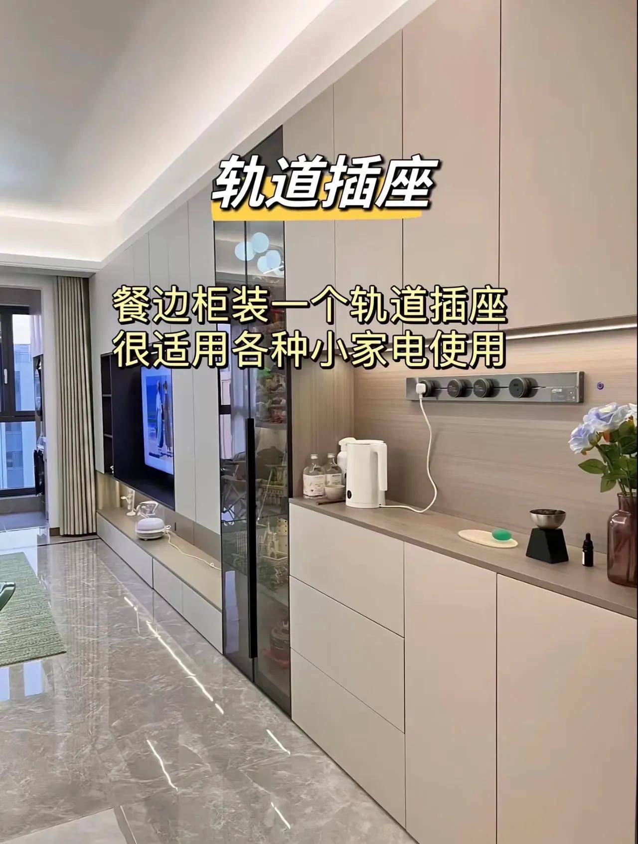 餐边柜和厨房操作台是小家电的聚集区域,传统插座位置固定、数目有限,经常不够使用。轨谈插座不错“随用随移”,咖啡机、空气炸锅、养生壶等思放在那儿就放在那儿。