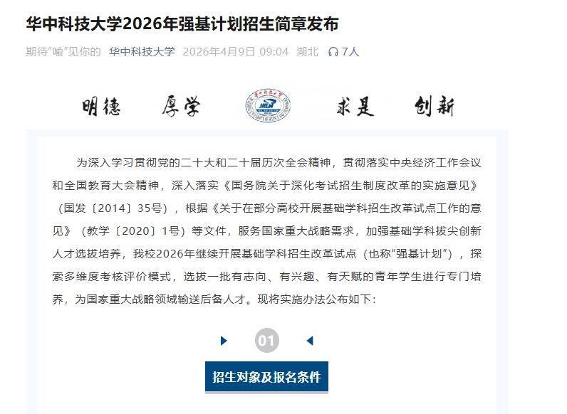 湖北日报讯(记者张歆)4月9日,华中科技大学发布2026年强基诡计招生简章。